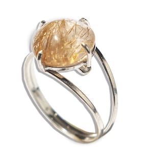 Anel Disco Pedra Rutilo no Quartzo 10mm Prata 950 Ajustável, Pedra Rutilo Dourado Incrustado no Quartzo Cristal Gema Cabochão Disco Liso Natural de garimpo, com lapidação manual aro ajustavel ao dedo serve do 10 ao 30 Prata de lei.