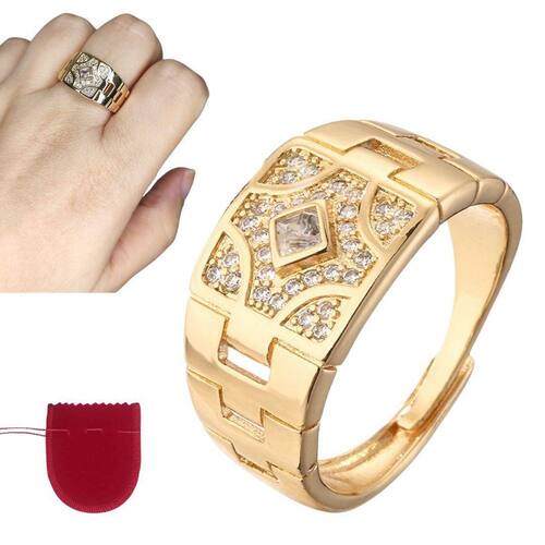 Anel Dourado Banhado a Ouro com Zircônias Ajustável Lindo Anel Ajustável Banhado a Ouro com Zircônias Perfeito para todas as ocasiões, inclusive para presentear, já que não precisa saber exatamente o tamanho pra comprar. Por ser ajustável cabe perfeitamente em qualquer circunferência anelar.Bela peça, acessório imponente, multifacetado, com fino acabamento.Largura de superfície: 20mm Peso líquido: cerca de 7,2g Acompanha saquinho de veludo. Marca: Pjk store
