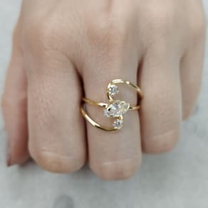 Anel Semijoia com Banho de Ouro 18k, Fio Cruzado com Zircônia Navete Central e duas Pedras Redondas Laterais.
