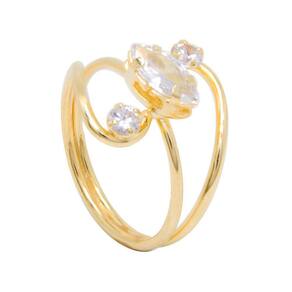 Anel Semijoia com Banho de Ouro 18k, Fio Cruzado com Zircônia Navete Central e duas Pedras Redondas Laterais.