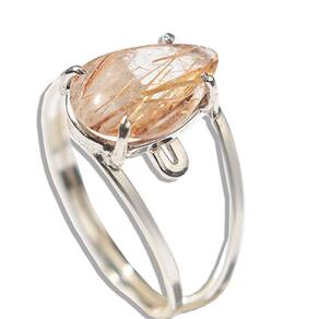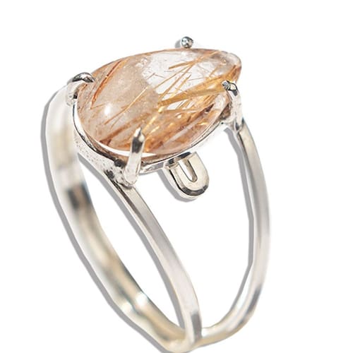 Anel Gota Pedra Rutilo no Quartzo Prata 950 Aro Ajustável, Pedra Rutilo Dourado Incrustado no Quartzo Cristal Gema Gota Cabochão Lisa Natural de garimpo, com lapidação manual aro ajustavel ao dedo serve do 10 ao 30 Prata de lei.