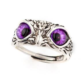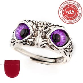 Anel prata 925 coruja sabedoria olho roxo ajustável Anel ajustável em prata esterlina 925 coruja com olhos realistas