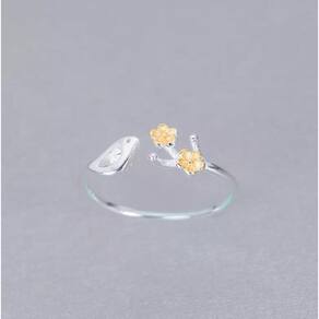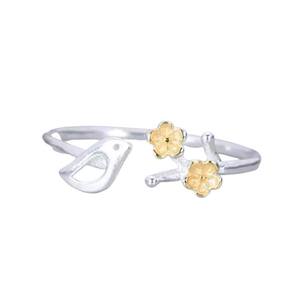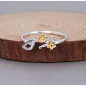 Anel Prateado Ajustável Passarinho Ramo Flor Amarela