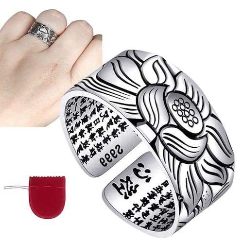 Anel Prateado Feng Shui Sorte Flor de Lótus Mantra Regulável Anel Prateado Flor de Lótus Ajustável você pode apertar ou alargar, caso seja necessário Perfeito para todas as ocasiões, inclusive para presentear, já que não precisa saber exatamente o tamanho pra comprar. Por ser ajustável cabe perfeitamente em qualquer circunferência anelar. Bela peça com ótimo acabamento.