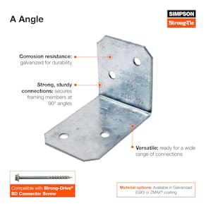 Os ângulos não apenas tornam as juntas mais fortes, mas também fornecem cantos retos e mais consistentes. A Simpson Strong-Tie oferece uma ampla variedade de ângulos em vários tamanhos e espessuras para lidar com trabalhos leves ou projetos em que uma conexão estrutural é necessária. Alguns podem ser dobrados (inclinados) para combinar com o projeto. Para projetos externos ou onde há umidade, use nossos conectores revestidos de zinco ZMAX, que oferecem resistência extra contra corrosão (procure um “Z” no final do número do modelo).