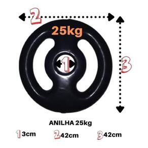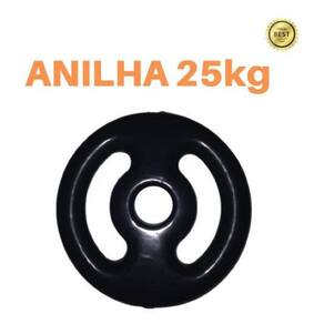 Características Peso - 25kg Diâmetro do furo central - 3cm Quantidade - 1 unidade Material - Ferro Fundido Revestimento - Borracha Cor - Preto Marca - Anilhas&Cia