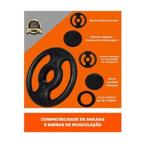 Fabricadas em ferro fundido, as anilhas possuem uma pintura na cor preta que além de dar um acabamento especial, também ajuda na proteção contra a oxidação. Com marcação referente ao seu respectivo peso, elas também possuem um vão para pegada, permitindo seu uso em diversos exercícios.