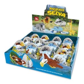 Animais da selva ovo surpresa - blocos de encaixe colecionável da xalingo. Ovinho de plástico com blocos para montar um animal da selva. São 12 modelos diferentes para misturar e criar. As peças são muito resistentes, leves e fáceis de montar. A quantidade de peças de cada varia conforme o modelo sendo de 26 a 33 peças. O ovo mede aproximadamente 8cm de altura. Não é possível escolher o modelo