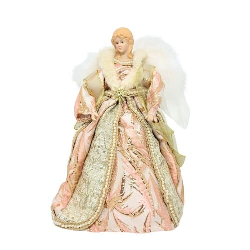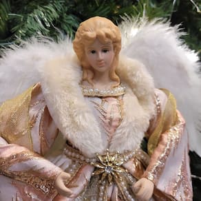Anjo Decorativo Ponteira de Árvore de Natal Luxo – 30cm, Roupa Rosê com Detalhes Dourados, Penas Naturais, Rosto em Resina e Braços Articulados