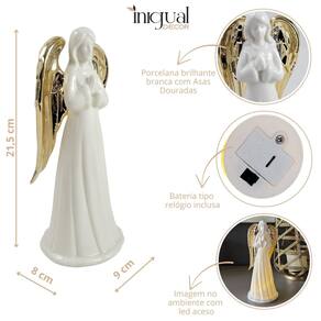 Anjo Decorativo Porcelana Branco Dourado 21cm Decoração Led Enfeite Decorativo de Anjo de Porcelana com LED Inigual Decor Adicione um toque de paz, elegância e luz à sua decoração de Natal com este Anjo Decorativo de Porcelana com LED da Inigual Decor. Esta peça é perfeita para simbolizar a serenidade e a beleza, criando um ambiente acolhedor e mágico em qualquer espaço da sua casa. Confeccionado em porcelana branca, o anjo possui um design clássico com delicadas asas na cor dourada, conferindo um visual sofisticado e atemporal. A iluminação de LED embutida projeta uma luz suave e acolhedora, destacando a figura e criando uma atmosfera de serenidade. Com 21,5 cm de altura, ele tem o tamanho ideal para mesas, prateleiras ou para compor um presépio com elegância. As pilhas já estão inclusas, permitindo que você a utilize imediatamente para iluminar sua decoração. É a escolha ideal para quem busca uma peça de alta qualidade que une a beleza da porcelana à magia da iluminação. Por Que Escolher o Anjo de Porcelana Inigual Decor Design Clássico: A porcelana branca e os detalhes dourados criam um visual elegante. Simbolismo de Paz: O anjo representa serenidade, ideal para a época natalina. Iluminação Acolhedora: Os LEDs internos proporcionam um brilho suave e convidativo. Praticidade de Uso: Com as pilhas inclusas, a peça está pronta para ser Utilizado assim que você a receber. Material de Alta Qualidade: A porcelana garante que a peça seja durável e com acabamento refinado. Especificações do Produto: Altura Aproximada: 21,5 cm Largura Aproximada: 9,0 cm Profundidade Aproximada: 8,0 cm Peso Aproximado: 410 g Material: Porcelana e LED Cor: Branco com asas douradas Conteúdo da Embalagem: 1 Enfeite Anjo Decorativo de Porcelana com LED Pilha inclusa Importante: Limpe delicadamente com um pano macio e seco. Observação: As imagens são ilustrativas. Itens decorativos adicionais exibidos nas fotos não acompanham o produto. Marca: Não Informado