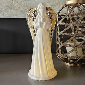 Anjo Decorativo Porcelana Branco Dourado 29cm Decoração Led Estátua de Anjo de Porcelana Branco e Dourado com LED Inigual Decor Adicione um toque de paz, elegância e luz à sua decoração com esta Estátua de Anjo de Porcelana com LED da Inigual Decor. Esta peça é perfeita para simbolizar a serenidade e a beleza, criando um ambiente acolhedor e mágico em qualquer espaço da sua casa. Confeccionada em porcelana branca, a estátua possui um design clássico com delicadas asas na cor dourada, conferindo um visual sofisticado e atemporal. A figura do anjo, em uma serena postura de oração, exala calma e tranquilidade. A iluminação de LED embutida projeta uma luz suave e acolhedora, destacando a peça e criando uma atmosfera de contemplação. Com 29 cm de altura, ela tem o tamanho ideal para se destacar com elegância em mesas, prateleiras ou lareiras. As pilhas já estão inclusas, permitindo que você a utilize imediatamente para iluminar sua decoração. É a escolha ideal para quem busca uma peça de alta qualidade que une a beleza da porcelana ao simbolismo celestial e à magia da iluminação. Por Que Escolher a Estátua de Anjo Inigual Decor Design Clássico: A porcelana branca e os detalhes dourados criam um visual elegante e atemporal. Simbolismo de Paz: A figura do anjo em oração transmite serenidade, ideal para qualquer época do ano. Iluminação Acolhedora: Os LEDs internos proporcionam um brilho suave e convidativo. Praticidade de Uso: Com as pilhas inclusas, a peça está pronta para ser Utilizado. Material de Alta Qualidade: A porcelana garante que a peça seja durável e com acabamento refinado. Especificações do Produto: Altura Aproximada: 29,0 cm Largura Aproximada: 12,5 cm Profundidade Aproximada: 11,5 cm Peso Aproximado: 735 g Material: Porcelana e LED Cor: Branco com asas douradas Conteúdo da Embalagem: 1 Estátua de Anjo de Porcelana com LED Pilha inclusa Importante: Limpe delicadamente com um pano macio e seco. Observação: As imagens são ilustrativas. Itens decorativos adicionais exibidos nas fotos não acompanham o produto. Marca: Não Informado
