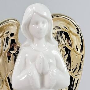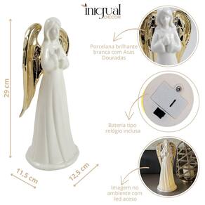 Anjo Decorativo Porcelana Branco Dourado 29cm Decoração Led Estátua de Anjo de Porcelana Branco e Dourado com LED Inigual Decor Adicione um toque de paz, elegância e luz à sua decoração com esta Estátua de Anjo de Porcelana com LED da Inigual Decor. Esta peça é perfeita para simbolizar a serenidade e a beleza, criando um ambiente acolhedor e mágico em qualquer espaço da sua casa. Confeccionada em porcelana branca, a estátua possui um design clássico com delicadas asas na cor dourada, conferindo um visual sofisticado e atemporal. A figura do anjo, em uma serena postura de oração, exala calma e tranquilidade. A iluminação de LED embutida projeta uma luz suave e acolhedora, destacando a peça e criando uma atmosfera de contemplação. Com 29 cm de altura, ela tem o tamanho ideal para se destacar com elegância em mesas, prateleiras ou lareiras. As pilhas já estão inclusas, permitindo que você a utilize imediatamente para iluminar sua decoração. É a escolha ideal para quem busca uma peça de alta qualidade que une a beleza da porcelana ao simbolismo celestial e à magia da iluminação. Por Que Escolher a Estátua de Anjo Inigual Decor Design Clássico: A porcelana branca e os detalhes dourados criam um visual elegante e atemporal. Simbolismo de Paz: A figura do anjo em oração transmite serenidade, ideal para qualquer época do ano. Iluminação Acolhedora: Os LEDs internos proporcionam um brilho suave e convidativo. Praticidade de Uso: Com as pilhas inclusas, a peça está pronta para ser Utilizado. Material de Alta Qualidade: A porcelana garante que a peça seja durável e com acabamento refinado. Especificações do Produto: Altura Aproximada: 29,0 cm Largura Aproximada: 12,5 cm Profundidade Aproximada: 11,5 cm Peso Aproximado: 735 g Material: Porcelana e LED Cor: Branco com asas douradas Conteúdo da Embalagem: 1 Estátua de Anjo de Porcelana com LED Pilha inclusa Importante: Limpe delicadamente com um pano macio e seco. Observação: As imagens são ilustrativas. Itens decorativos adicionais exibidos nas fotos não acompanham o produto. Marca: Não Informado