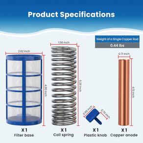 - O pacote inclui: 1 x ânodo de cobre, 1 x cesta rosqueada, 1 x mola helicoidal e 1 x parafuso de asa.