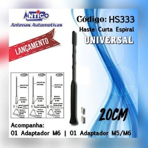 - Comprimento da antena: 20Cm - Complemento: Haste Flexível - Cor: Preta. - Funcionalidade: Receptiva AM / FM - Modelo: Espiral.