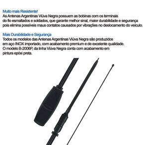 Todos os modelos das Antenas Argentinas Viúva Negra são produzidos em aço INOX importado, com acabamento premium e de excelente qualidade. O modelo B-2006P, da linha Viúva Negra conta com acabamento em pintura epóxi preta.As Antenas Argentinas e Viúva Negra possuem as bobinas com os terminais do fio esmaltados e soldados, que garante melhor sinal, maior durabilidade e segurança pois elimina possíveis maus contatos causados por vibrações no deslocamento do veículo.Com um design compacto, ela é muito menor que as antenas convencionais, porém, com um ganho até 2x maior. Além disso, possuem muitos difereciais:- Baixíssimo VSWR, que garente menos perdas na transmissão.- Produzidas em aço INOX importado, com acabamento premium e de excelente qualidade.- Tabela de ajuste de frequência exclusiva para os modelos Aquário.- Hastes telescópicas utilizadas para ajustar o tamanho e garantir a máxima potência dos produtos.Por possuírem hastes telescópicas, você pode ajustar o tamanho da antena de acordo com a sua necessidade para garantir que a antena opere na frequência desejada, obtendo assim uma melhor transmissão no seu rádio PX.Só a Aquário possui uma ?Tabela de Ajuste? exclusiva para as Antenas Argentinas e Viúva Negra, desenvolvida para auxiliar no ajuste da antena. O Manual de Instruções oferece todas as informações necessárias para te ajudar a instalar a antena e ajustá-la.Especificações Técnicas:Frequência: 23,5 - 32MHzVSWR:
