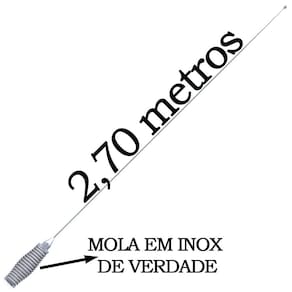 IDEAL PARA VEÍCULOS GRANDESAntena Móvel 1/4 de onda indicada para comunicação em veículos equipados com rádio PX. Apresenta excelente rendimento, caracterizando-se como a antena de maior alcance em operação móvel. Ela é produzida em aço inox especial, submetido a tratamento térmico, que faz com que a haste se mantenha sempre reta. A base, com sistema de molas, ajuda a diminuir o impacto e aumenta durabilidade da antena.BASE ESTÁVELA base conta com o sistema de molas que ajuda a diminuir o impacto, garantindo boa durabilidade.HASTE EM AÇO INOXProduzida em aço inox especial, submetido a tratamento térmico, que faz com que a haste se mantenha sempre reta.ALTO PADRÃO DE QUALIDADEO uso de materiais nobres como Aço Inox e o latão cromado, garantem a essa antena uma grande durabilidade. Você não terá que se preocupar por um bom tempo!MAIS SEGURANÇAA antena Marinox já possui sistema que permite a aplicação de Trava anti-furto, garantindo assim muito mais segurança.2,70 DE COMPRIMENTOMAIOR ALCANCE EM OPERAÇÃO MÓVELPRINCIPAIS BENEFÍCIOS- Maior alcance em operação móvel - Haste produzida em aço inox especial. Não deforma, mantendo-se sempre reta - Produzida com exclusivo sistema de trava que protege contra roubo - Proporciona conforto e segurança nas viagens, permitindo a comunicação rápida e eficiente via rádio - Sistema de mola que diminui o impacto e aumenta a durabilidade do produto - A instalação é feita com suporte e cabo - Alta resistência á corrosão, mesmo em regiões litorâneas - Produto nacional, com garantia de 1 ano contra defeitos de fabricaçãoESPECIFICAÇÕES TÉCNICASCÓDIGO DO PRODUTO: B-2003FREQUÊNCIA: 25 A 54MHZGANHO: 2.23DBIVSWR: menor que 1.5:1IMPEDÂNCIA: 50 OHMSPOTÊNCIA MÁXIMA:500WLARGURA DE FAIXA: 3.5MHZMATERIAL: AÇO INOX E LATÃO CROMADODIMENSÕES DO PRODUTO: 2,790MMPESO DO PRODUTO: 900G Itens Inclusos:01 Antena Móvel PX Mola Inox 2,70m B-200301 Suporte Traseiro Scania Série 5 Lado Motorista01 Cabo de 5,5 metros com conector B-300101 Parafuso antifurto R-30