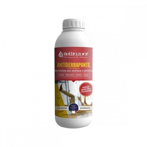 Especificações técnicas: - Produto: Antiderrapante Bellinzoni - Finalidade: Aumentar a aderência de pisos de cerâmica, porcelanato e pedras em geral - Composição: Fórmula à base de água - Aplicação: Fácil e rápida - Manutenção: Não requer manutenção periódica - Tonalidade: Não altera a tonalidade do material tratado - Áreas de aplicação: Internas e externas - Restrição: Não pode ser aplicado em mármore