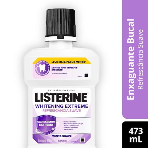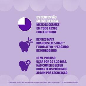 Você sabia que os dentes são apenas 25% da sua boca? Por isso, apenas a escovação não garante uma limpeza completa. Adicione LISTERINE Whitening Extreme Enxaguante Bucal, 473mL à sua rotina e limpe aonde a escova não alcança, eliminando até 99, 9% dos germes* causadores de mau hálito, placa bacteriana e gengivite. Com ação branqueadora, ele mata os germes que causam o mau hálito e clareia os dentes. Inclua LISTERINE e limpe até 100% da sua boca.