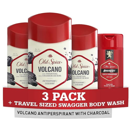 Old Spice Vulcão antitranspirante e desodorante masculino com carvão, 74 g (pacote com 3) com sabonete líquido Swagger tamanho viagem