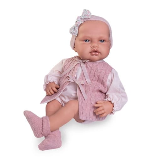 A boneca acompanha tiara, laço de cabelo, blusa de tricô, suéter, shortinho, calça, meias, chupeta com corrente e uma almofada de amamentação/estampada.