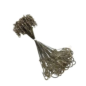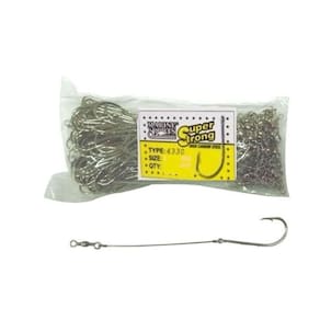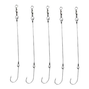 Anzol 5/0 = 4,5cm x 2,2cm ; ;- 10,5 cm de cabo de aço 40 lb - girador = 2,3 cm.