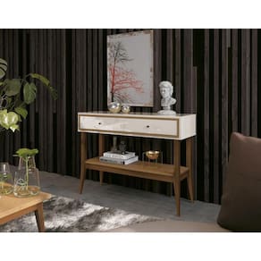 ESPECIFICAÇÕES TÉCNICAS: - Material: MDP; - Acabamento: Pintura UV; - Número de Portas: Não Possui; - Número de Gavetas: 2 Gavetas; - Número de Nicho: Não Possui; - Possui Vidro? Sim; - Possui Prateleira? Sim; - Possui Pés? Sim; - Material dos Pés: Madeira Maciça; - Possui Puxadores? Sim; - Material dos Puxadores: ABS; - Produto precisa de montagem? Sim; - Garantia: 3 Meses Contra defeito de fabricação; - Medidas: LarguraxProfundidadexAltura; 105x34,5x70,5cm;