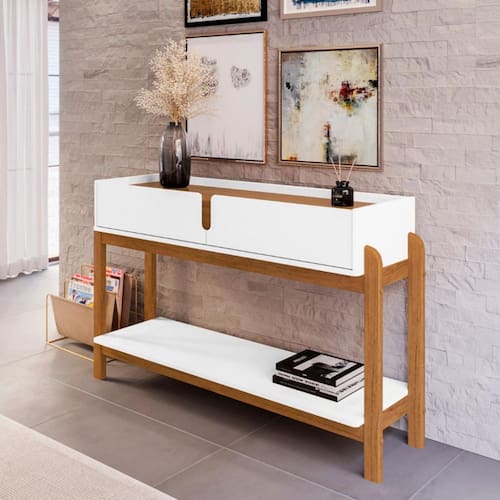 Características: Tampo em MDP de 15mm Laterais, base e prateleiras em MDF de 15mm Laterais com bordas arredondadas e laqueadas 2 Gavetas Corrediças telescópicas 4 Pés elaborados em madeira maciça