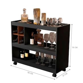 Além de ser produzido em MDP, o Aparador possui 4 Rodízios para melhor movimentação e 4 Espaços para Garrafas e Copos.