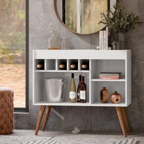 O modelo conta com pés em madeira, que garantem firmeza, durabilidade e um toque natural ao ambiente. Possui prateleiras funcionais para organização de itens decorativos, utensílios ou taças, além de espaço dedicado para adega, ideal para armazenar garrafas de vinho com elegância e praticidade.