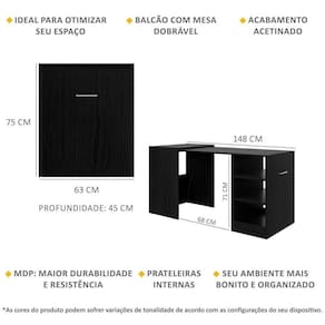 Dimensões do produto montado: Altura: 75cm | Largura: 63cm | Profundidade: 45cm Largura Mesa (aberta): 148cm *Você pode consultar as medidas internas na imagem técnica do produto.