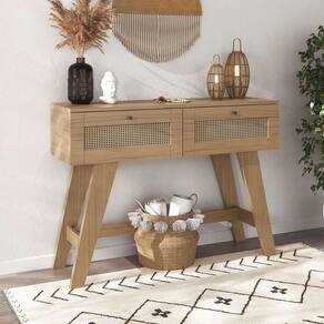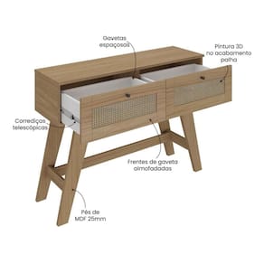 - Detalhes em impressão palha: Acabamento refinado no estilo Boho Chic, que adiciona sofisticação e destaque ao aparador. - Organização eficiente: Duas gavetas para manter tudo organizado, dos documentos aos itens decorativos, mantendo a sala ou hall de entrada sempre arrumado. - Pés estáveis em MDF: Pés sólidos garantem estabilidade e um visual moderno, harmonizando com diferentes decorações. - Traseira revestida: permite o uso em qualquer espaço, inclusive como divisória de ambientes ou atrás do sofá. - Durabilidade e estilo: Produzido em MDP com pintura UV.