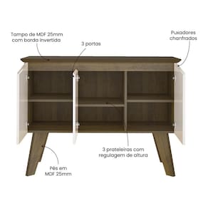 - Produzido em MDF com Pintura UV: Durabilidade e facilidade na limpeza. - Tampo com Borda Invertida: Detalhe refinado que destaca a sofisticação do móvel. - 3 Portas com Puxador Chanfrado: Um toque de requinte aliado à praticidade de abertura. - 3 Prateleiras Ajustáveis: Versatilidade para organizar conforme sua necessidade. - Pés de MDF para Estabilidade: Oferecem resistência e um acabamento moderno. - Puxador com Abertura Usinada: Detalhe meticulosamente trabalhado para um visual impecável. - Design Inteligente e Moderno: Um aparador que combina estilo e utilidade. - Adapta-se a Diferentes Ambientes: Ideal para salas de jantar, cozinhas ou espaços diversos.