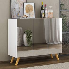 O Aparador Buffet 3 Portas com Espelho Retrô Vegas Multimóveis é produzido em MDP, que garante maior durabilidade, facilidade na limpeza, além de um acabamento superior. Com 3 portas, possui acabamento acetinado (cerca de 20% de brilho) e um excelente espaço interno para organizar seus pertences (as prateleiras internas suportam 2 e 5 Kg cada e o tampo 7 Kg). Os pés retrô, em polipropileno, e os detalhes com espelhos nas portas dão um charme especial ao móvel deixando-o com um visual leve e permitindo você compor um ambiente com ar vintage e moderno ao mesmo tempo. Os espelhos são de vidro (o que evita que a imagem fique distorcida) e lapidados, ou seja, passam por um processo para que as bordas não fiquem cortantes, o que garante maior segurança. Seu design minimalista, torna o móvel muito versátil, podendo ser utilizado de diversas maneiras e em qualquer ambiente.