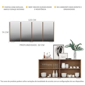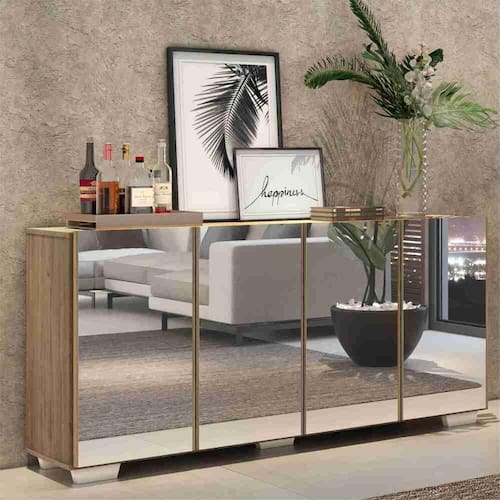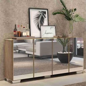 O Aparador Buffet 4 portas com Espelho e Pés Quadrados Vegas é produzido em MDP, que garante maior durabilidade, além de um acabamento superior. Com 4 portas, possui acabamento acetinado (cerca de 20% de brilho) e um excelente espaço interno para organizar seus pertences (as prateleiras internas suportam 5 Kg cada e o tampo 10 Kg). Os pés quadrados, em polipropileno, facilitam na hora da limpeza. Os detalhes com espelhos nas portas deixam o móvel mais requintado, criando um ambiente moderno e charmoso. Os espelhos são de vidro (o que evita que a imagem fique distorcida) e lapidados, ou seja, passam por um processo para que as bordas não fiquem cortantes, o que garante maior segurança. Seu design minimalista, torna o móvel muito versátil, podendo ser utilizado de diversas maneiras e em qualquer ambiente.