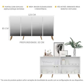 O Aparador Buffet 4 portas com Espelho e Pés Retrô Vegas Multimóveis é produzido em MDP, que garante maior durabilidade, facilidade na limpeza, além de um acabamento superior. Com 4 portas, possui acabamento acetinado (cerca de 20% de brilho) e um excelente espaço interno para organizar seus pertences (as prateleiras internas suportam 5 Kg cada e o tampo 10 Kg). Os pés retrô, em polipropileno, e os detalhes com espelhos nas portas dão um charme especial ao móvel deixando-o com um visual leve e permitindo você compor um ambiente com ar vintage e moderno ao mesmo tempo. Os espelhos são de vidro (o que evita que a imagem fique distorcida) e lapidados, ou seja, passam por um processo para que as bordas não fiquem cortantes, o que garante maior segurança. Seu design minimalista, torna o móvel muito versátil, podendo ser utilizado de diversas maneiras e em qualquer ambiente.