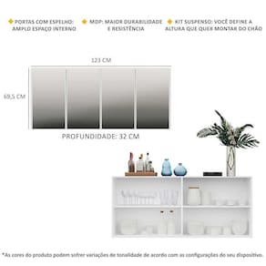 Dimensões do produto montado: Altura: 69,5cm | Largura: 123cm | Profundidade: 32cm *Você pode consultar as medidas internas na imagem técnica do produto.