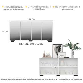 O Aparador Buffet 4 portas com Espelho e Pés Quadrados Vegas é produzido em MDP, que garante maior durabilidade, além de um acabamento superior. Com 4 portas, possui acabamento acetinado (cerca de 20% de brilho) e um excelente espaço interno para organizar seus pertences (as prateleiras internas suportam 5 Kg cada e o tampo 10 Kg). Os pés quadrados, em polipropileno, facilitam na hora da limpeza. Os detalhes com espelhos nas portas deixam o móvel mais requintado, criando um ambiente moderno e charmoso. Os espelhos são de vidro (o que evita que a imagem fique distorcida) e lapidados, ou seja, passam por um processo para que as bordas não fiquem cortantes, o que garante maior segurança. Seu design minimalista, torna o móvel muito versátil, podendo ser utilizado de diversas maneiras e em qualquer ambiente.