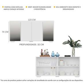 O Aparador Buffet com Espelho e Pés Quadrados Vegas Multimóveis é produzido em MDP, que garante maior durabilidade, além de um acabamento superior. Com 4 portas, possui acabamento acetinado (cerca de 20% de brilho) e um excelente espaço interno para organizar seus pertences (as prateleiras internas suportam 5 Kg cada e o tampo 10 Kg). Os pés quadrados, em polipropileno, facilitam na hora da limpeza. Os detalhes com espelhos nas portas deixam o móvel mais requintado, criando um ambiente moderno e charmoso. Os espelhos são de vidro (o que evita que a imagem fique distorcida) e lapidados, ou seja, passam por um processo para que as bordas não fiquem cortantes, o que garante maior segurança. Seu design minimalista, torna o móvel muito versátil, podendo ser utilizado de diversas maneiras e em qualquer ambiente.