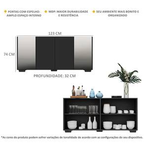 O Aparador Buffet com Espelho e Pés Quadrados Vegas Multimóveis é produzido em MDP, que garante maior durabilidade, além de um acabamento superior. Com 4 portas, possui acabamento acetinado (cerca de 20% de brilho) e um excelente espaço interno para organizar seus pertences (as prateleiras internas suportam 5 Kg cada e o tampo 10 Kg). Os pés quadrados, em polipropileno, facilitam na hora da limpeza. Os detalhes com espelhos nas portas deixam o móvel mais requintado, criando um ambiente moderno e charmoso. Os espelhos são de vidro (o que evita que a imagem fique distorcida) e lapidados, ou seja, passam por um processo para que as bordas não fiquem cortantes, o que garante maior segurança. Seu design minimalista, torna o móvel muito versátil, podendo ser utilizado de diversas maneiras e em qualquer ambiente.