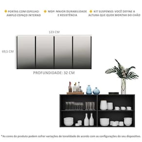 Os detalhes com espelhos nas portas deixam o móvel mais requintado, criando um ambiente moderno e charmoso. Os espelhos são de vidro (o que evita que a imagem fique distorcida) e lapidados, ou seja, passam por um processo para que as bordas não fiquem cortantes, o que garante maior segurança. Seu design minimalista, torna o móvel muito versátil, podendo ser utilizado de diversas maneiras e em qualquer ambiente.