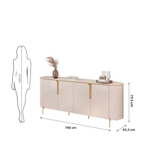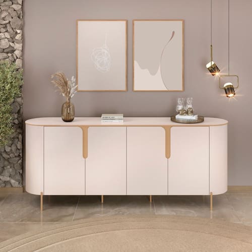 O Aparador Buffet 4 Portas com P?s Cleo DJ M?veis ? um m?vel moderno e sofisticado, ideal para complementar a sala de jantar. Possui design com cantos arredondados, tampo de 25mm com bordas em pintura PU e quatro portas de giro em MDF com detalhes usinados. Com duas prateleiras internas, oferece funcionalidade e organiza??o. Sua estrutura robusta conta com p?s met?licos cil?ndricos, combinando estilo.