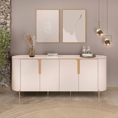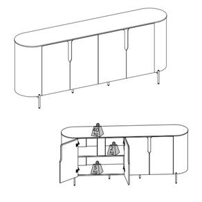 O Aparador Buffet 4 Portas com Pes Cleo DJ Moveis e um movel moderno e sofisticado, ideal para complementar a sala de jantar. Possui design com cantos arredondados, tampo de 25mm com bordas em pintura PU e quatro portas de giro em MDF com detalhes usinados. Com duas prateleiras internas, oferece funcionalidade e organizacao. Sua estrutura robusta conta com pes metalicos cilindricos, combinando estilo.