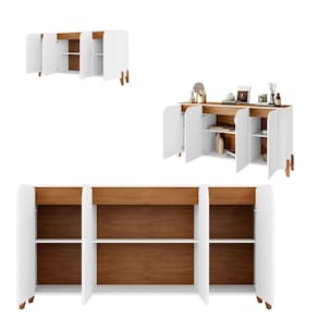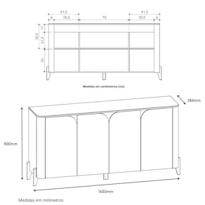 Características: 6 Nichos 4 Portas sem puxadores 5 Pés de Madeira Maciça 3 Prateleiras internas Acabamento em pintura UV Cantos arredondados Dobradiças com sistema softclose Estrutura em MDF 15mm e 3mm, MDP de 15mm Peso Suportado 75Kg Tampo e portas usinados de MDF