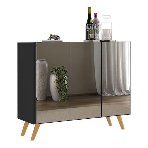O Aparador Buffet 3 Portas com Espelho Retrô Vegas Multimóveis é produzido em MDP, que garante maior durabilidade, facilidade na limpeza, além de um acabamento superior. Com 3 portas, possui acabamento acetinado (cerca de 20% de brilho) e um excelente espaço interno para organizar seus pertences (as prateleiras internas suportam 2 e 5 Kg cada e o tampo 7 Kg). Os pés retrô, em polipropileno, e os detalhes com espelhos nas portas dão um charme especial ao móvel deixando-o com um visual leve e permitindo você compor um ambiente com ar vintage e moderno ao mesmo tempo. Os espelhos são de vidro (o que evita que a imagem fique distorcida) e lapidados, ou seja, passam por um processo para que as bordas não fiquem cortantes, o que garante maior segurança. Seu design minimalista, torna o móvel muito versátil, podendo ser utilizado de diversas maneiras e em qualquer ambiente.