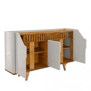 O Aparador Buffet 4 PortasTamisa Bechara é a escolha perfeita para deixar sua sala ainda mais charmosa e elegante. Com um design retrô, ele agrega um toque de requinte ao ambiente. O buffet conta com quatro portas equipadas com dobradiças metálicas, sendo que duas delas apresentam um design inovador, com bordas superiores usinadas em ângulo, oferecendo um visual diferenciado. Possui um amplo nicho interno e duas prateleiras, proporcionando bastante espaço para organização. O tampo espaçoso é ideal para acomodar bebidas, objetos de decoração e taças.