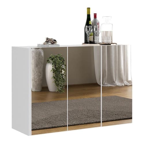 O Aparador Buffet 3 Portas com Espelho Vegas Multimóveis é produzido em MDP, que garante maior durabilidade, facilidade na limpeza, além de um acabamento superior. Com 3 portas, possui acabamento acetinado (cerca de 20% de brilho) e um excelente espaço interno para organizar seus pertences (as prateleiras internas suportam 2 e 5 Kg cada e o tampo 7 Kg). Os detalhes com espelhos nas portas deixam o móvel mais requintado, criando um ambiente moderno e charmoso. Os espelhos são de vidro (o que evita que a imagem fique distorcida) e lapidados, ou seja, passam por um processo para que as bordas não fiquem cortantes, o que garante maior segurança. Seu design minimalista, torna o móvel muito versátil, podendo ser utilizado de diversas maneiras e em qualquer ambiente.