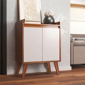 Conta com uma prateleira interna que amplia o espaço de armazenamento, mantendo livros, taças ou objetos decorativos sempre organizados e à mão.