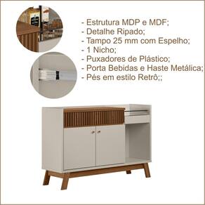 O Buffet Lucca vai encantar o seu ambiente! Com design moderno, possui uma gaveta com detalhe ripado e corrediça telescópica e ainda duas portas de abrir para você guardar objetos que não precisam ficar à mostra. Possui um porta bebidas com haste metálica e espelho. Conta também com pés em estilo retrô, trazendo ainda mais elegância ao seu ambiente.