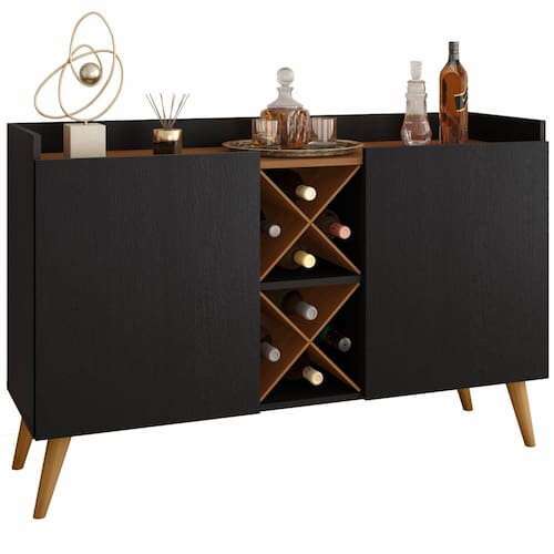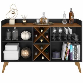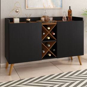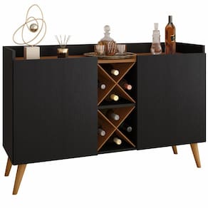 O aparador Buffet Zanzini Max é versátil, charmoso e delicado, perfeito para expor seus objetos de decoração com elegância e sofisticação, perfeito para compor ambientes como Hall de Entrada, Sala de Jantar, Sala de Estar. Contém tampo superior com formato estilo bandeja, portas nas extremidades, prateiras com excelente espaço interno e adega para 8 garrafas estilo "X" na parte central. Os pés estilo retro completam o visual incrível deste móvel.
