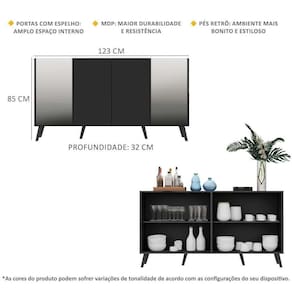 O Aparador Buffet com Espelho e Pés Retrô Vegas Multimóveis é produzido em MDP, que garante maior durabilidade, facilidade na limpeza, além de um acabamento superior. Com 4 portas, possui acabamento acetinado (cerca de 20% de brilho) e um excelente espaço interno para organizar seus pertences (as prateleiras internas suportam 5 Kg cada e o tampo 10 Kg). Os pés retrô, em polipropileno, e os detalhes com espelhos nas portas dão um charme especial ao móvel deixando-o com um visual leve e permitindo você compor um ambiente com ar vintage e moderno ao mesmo tempo. Os espelhos são de vidro (o que evita que a imagem fique distorcida) e lapidados, ou seja, passam por um processo para que as bordas não fiquem cortantes, o que garante maior segurança. Seu design minimalista, torna o móvel muito versátil, podendo ser utilizado de diversas maneiras e em qualquer ambiente.